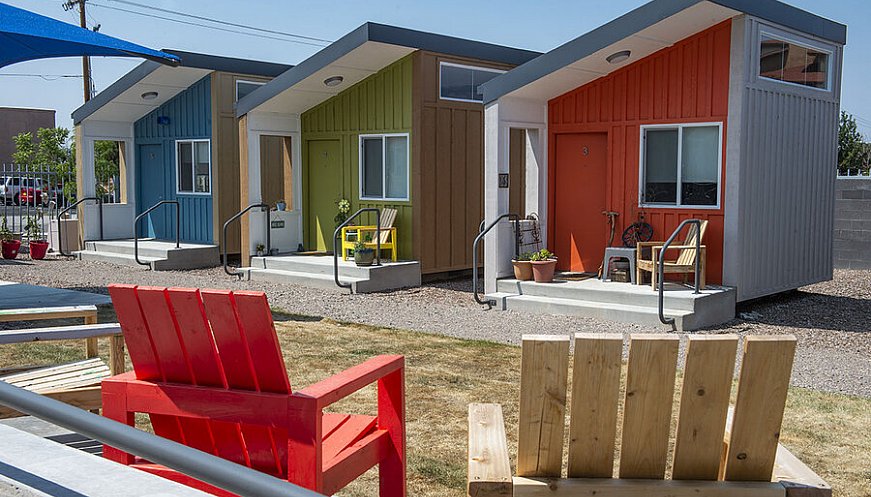 Ad Albuquerque, in New Mexico, si trova il Tiny Home Village. Si tratta di un programma sperimentale, che da febbraio di quest’anno, si è impegnato a fornire ai residenti senzatetto il supporto necessario per passare dalla vita di strada ad un alloggio permanente. Il Tiny Home Village è formato da 30 case indipendenti, ognuna con la stessa disposizione: letto, scrivania, due sedie, scaffali e un armadio, incluso un piccolo patio all’entrata dell’unità abitativa.