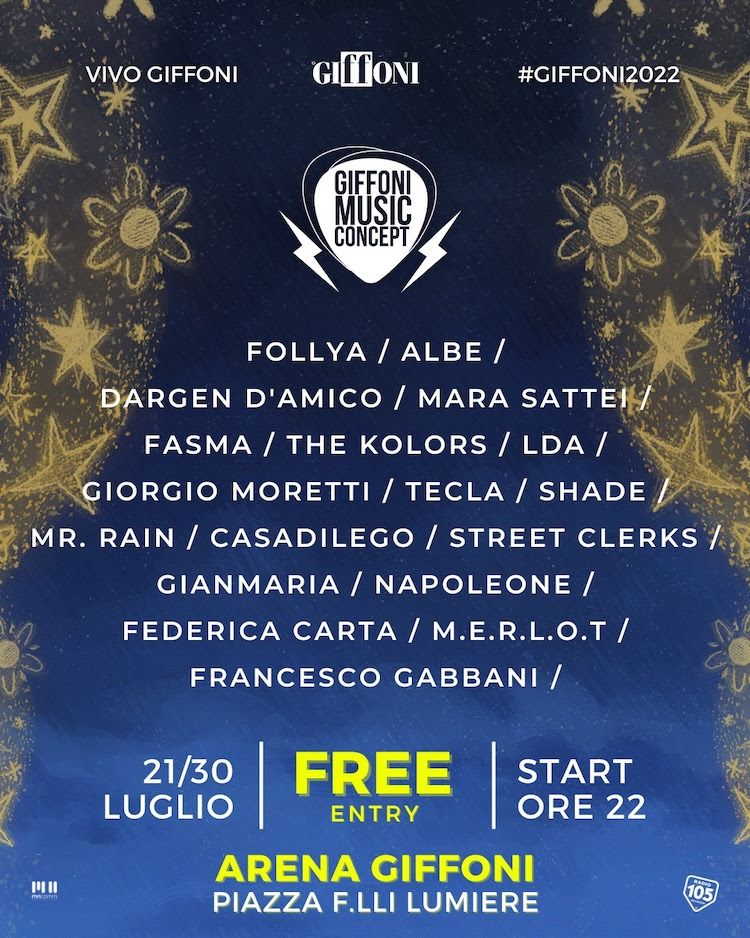 Dargen D’Amico, Francesco Gabbani, Mara Sattei, The Kolors, Follya, LDA, Shade e non solo: dal 21 al 30 luglio a Giffoni Valle Piana (Sa), nell’arena di Piazza Fratelli Lumiere, torna il Giffoni Music Concept, la costola musicale del Giffoni Film Festival che vedrà protagonisti 30 artisti e 10 showcase. Tornano dal vivo i talenti più amati del panorama musicale italiano.