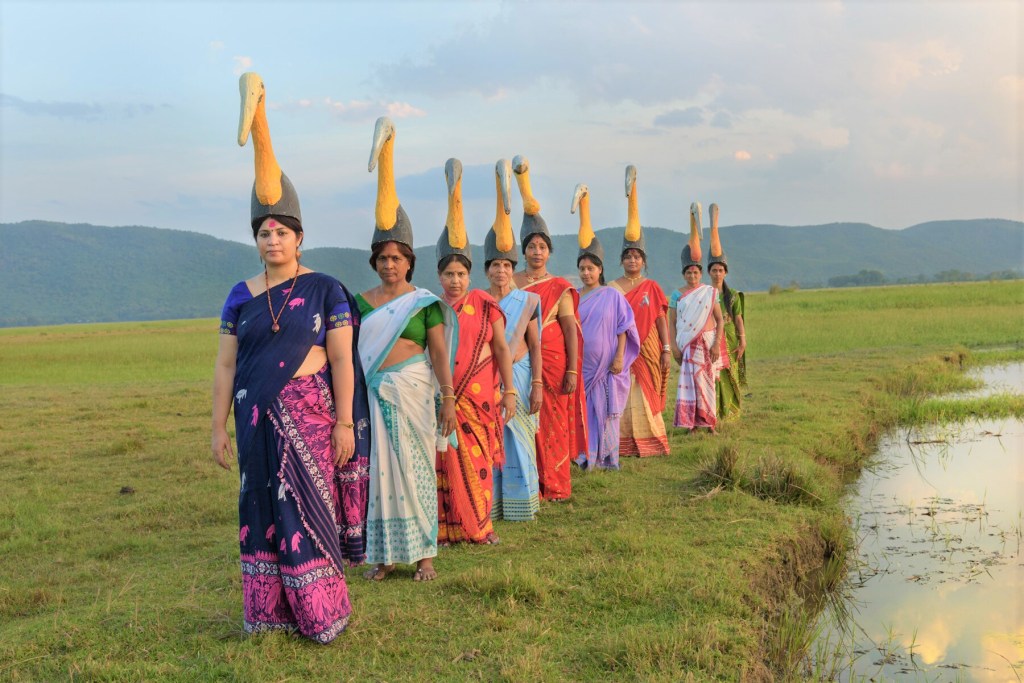 Queste donne che si vedono nelle immagini proposte, originarie dello stato indiano dell’Assam, indossano un cappello di cartapesta simboleggiante il marabù asiatico, una razza di cicogna che è ad altissimo rischio di estinzione. Specialmente in passato, il marabù, noto anche con il nome di “Greater Adjutant” (Leptoptilos Dubius) è stato spesso cacciato e discriminato per via del suo cattivo odore, di una dieta ricca a base di carogne e soprattutto per il suo aspetto sgradevole. Per molti anni i loro nidi sono stati distrutti dalle diverse comunità perché considerati parassiti e portatori di cattivi presagi. L’uccisione su larga scala, causata da tutte queste superstizioni, ha fatto sì che oggi, questa specie, si sia quasi estinta.