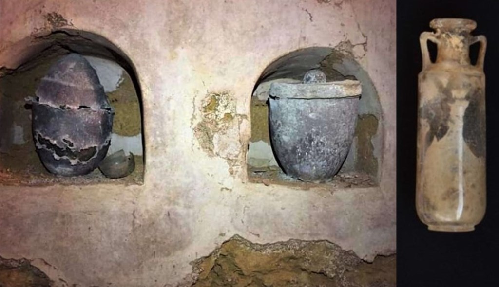 Qui gli archeologi hanno trovato i resti di una borsa con dentro un flacone di cristallo di rocca, intatto, – contenente il profumo – e tre grani di ambra. Il materiale, ben conservato all’interno del cristallo, è stato esaminato con raggi X, gascromatografia e spettrometria di massa.