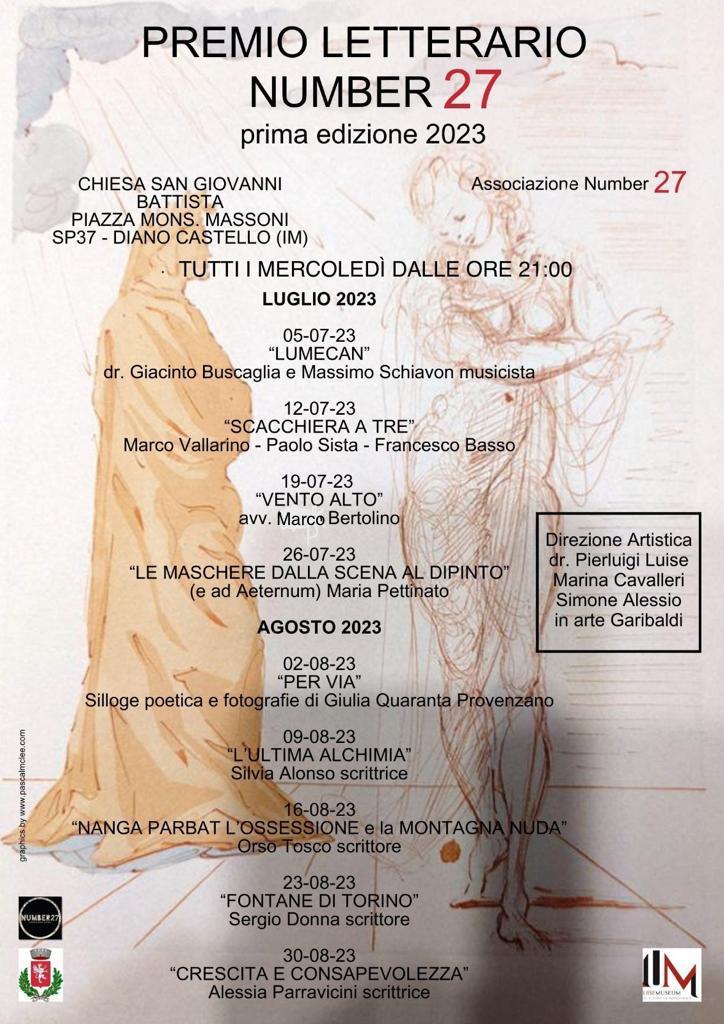 Ogni mercoledì di luglio e ogni mercoledì di agosto, alle ore 21:00, ci sarà inoltre un incontro con l’autore all’interno della I° Edizione del PREMIO LETTERARIO NUMBER27. Nel contesto della mostra, nonché dell’or detta rassegna culturale – a cura del dr. Pierluigi Luise, di Marina Cavalleri e di Simone Alessio, in arte Garibaldi – verranno presentati i libri inediti di scrittori, giornalisti e critici d’arte. Incontri, questi, che avranno luogo sempre presso la Chiesa di San Giovanni Battista.