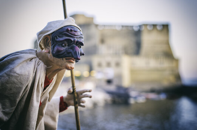 Ci sono diverse leggende sull’ambiguo e probabilmente doppio personaggio di Pucinella: la storia popolare vuole che nasca proprio ad Acerra come contadino, un certo Puccio d’Aniello chiamato “Pulecenella”, altre leggende lo vogliono invece nato dal Vesuvio. Il personaggio ha preso storicamente vita nella Commedia dell’Arte intorno alla seconda metà del 1500 grazie all’attore Silvio Fiorillo, anche se le sue origini risalgono addirittura alle Atellane romane.